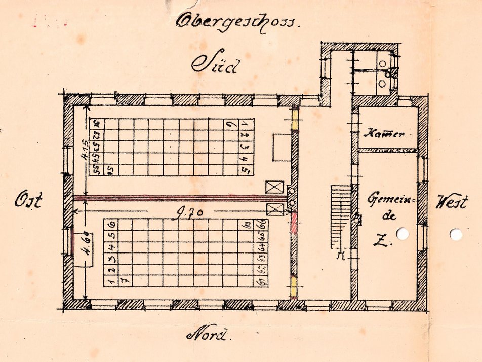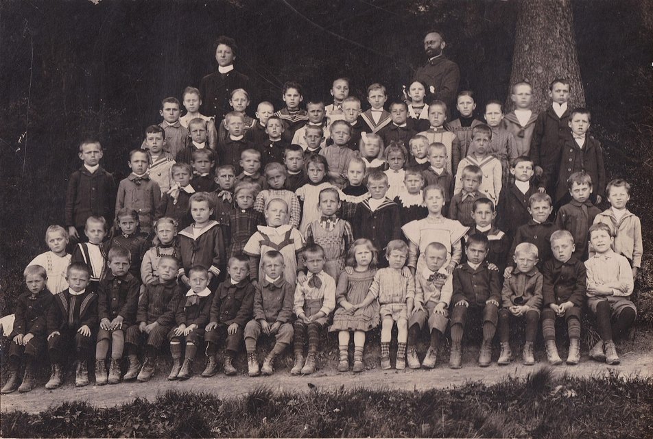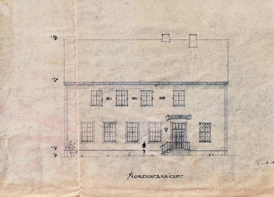 1875 lässt die Gemeinde die alte „Mesner-Sölde" abreißen und ein schlichtes Schulgebäude errichten. Im Obergeschoss befindet sich neben der Gemeindekanzlei ein großer Schulsaal für 70 Kinder, während der Lehrer die Räumlichkeiten im Erdgeschoß bewohnt.