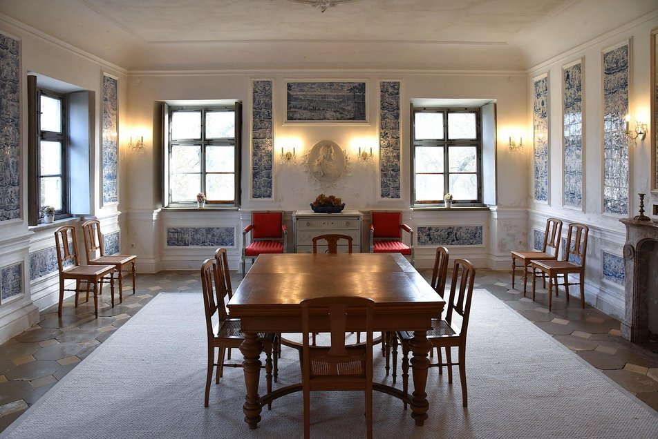 Er stattet das Schloss mit opulenten Stuckdecken aus, die sich bis heute in der ersten Etage des älteren Südteils erhalten haben.