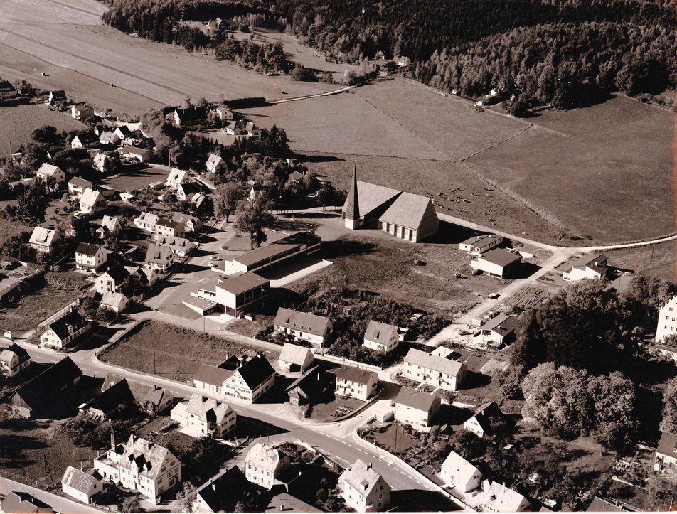 In den Jahren 1966 und 67 entsteht mit dem Neubau von Schule und Gemeindeverwaltung zusammen mit der neuen St. Martins-Kirche eine neue Ortsmitte.